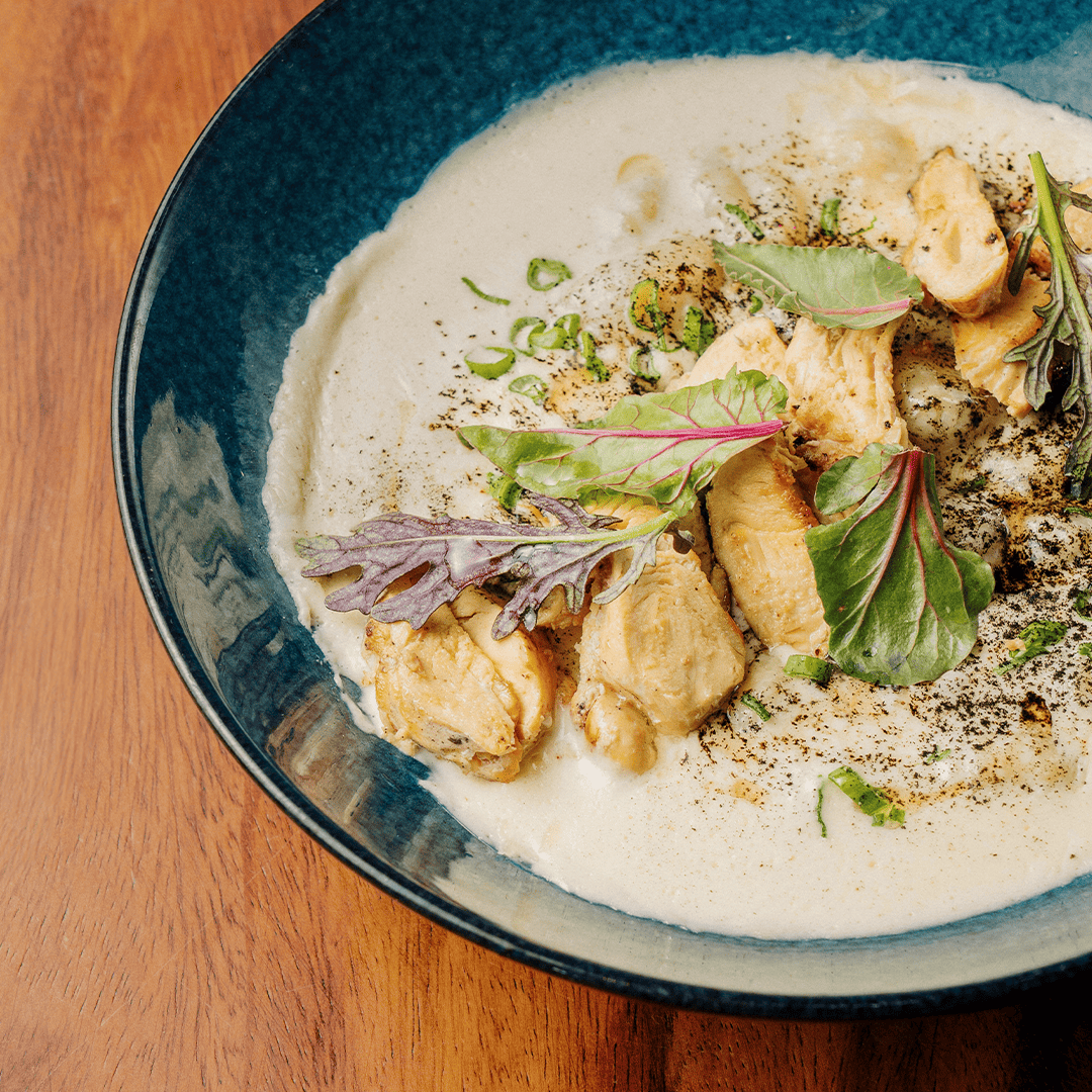 Salsa de ajo rostizado, queso parmesano y scallions.
